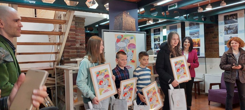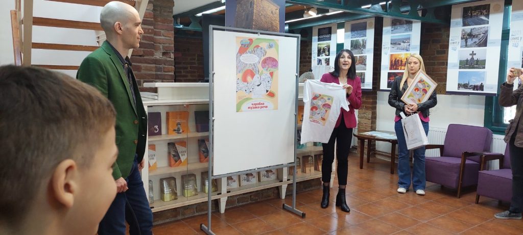 Михаило Миловановић, ученик II2 одушевљено је посматрао први плакат који је данас изложен у Музеју завичајних писаца. Плакат под називом “Чаробна музика речи” је настао заједничким радом малих уметника и академских стваралаца. Михаило Миловановић II2, Олга Глишић и Ива Бошковић VIII2, награђени су урамљеним плакатом, мајцом са одштампаним плакатом и чланском картом библиотеке. Све честитке награђеним ученицима.