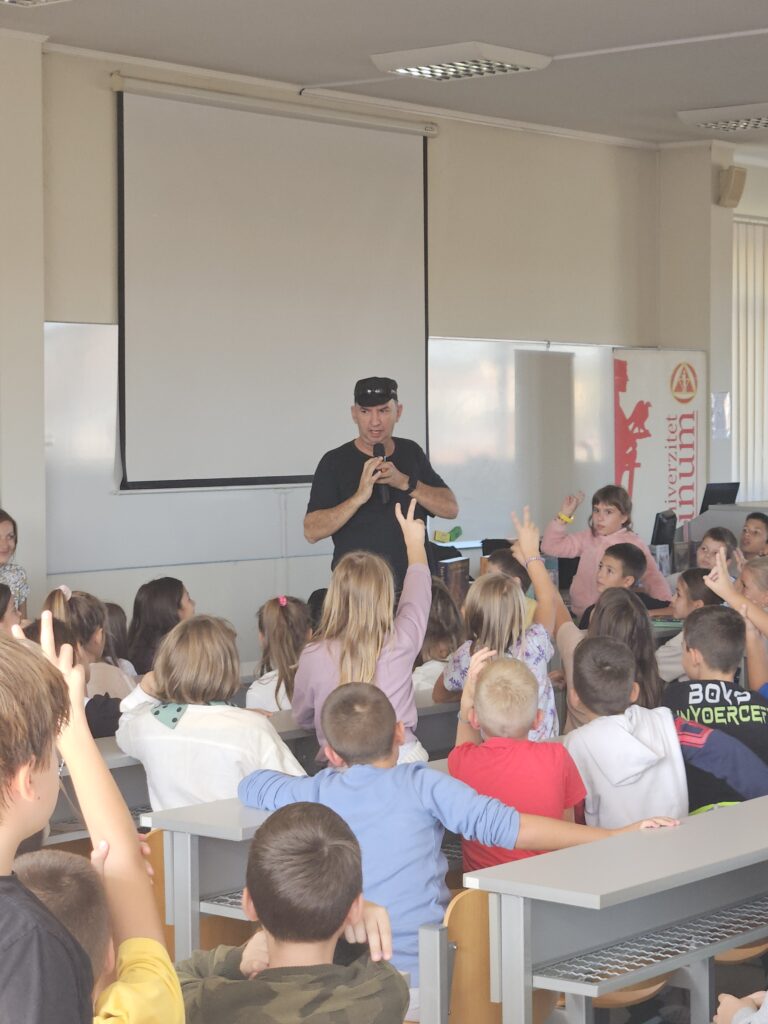 Ученици другог и трећег разреда, данас су присуствовали радионици писца Уроша Петровића у амфитеатру универзитета Сунгидунум, а у организацији Матична библиотека “Љубомир Ненадовић” . Деца су се сјајно забавила уз подстицајне загонетке овог нашег занимљивог писца и уживала решавајући их.