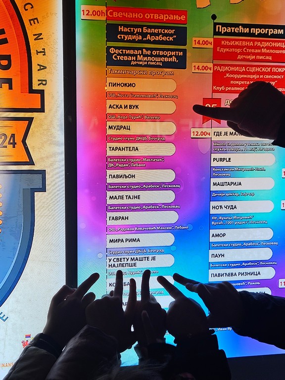 Обе представе: “Аска и @vuk” ученика 6. разреда и “У свету маште је најлепше” ученика 2. разреда, изведене су првог дана фестивала. Публика је помно пратила оба сјајна извођења наших младих глумаца. Тог дана је изведено 12 минијатура, поред наших, ученика из Лесковца, Београда, Лебана, Сопота и Богојевца.