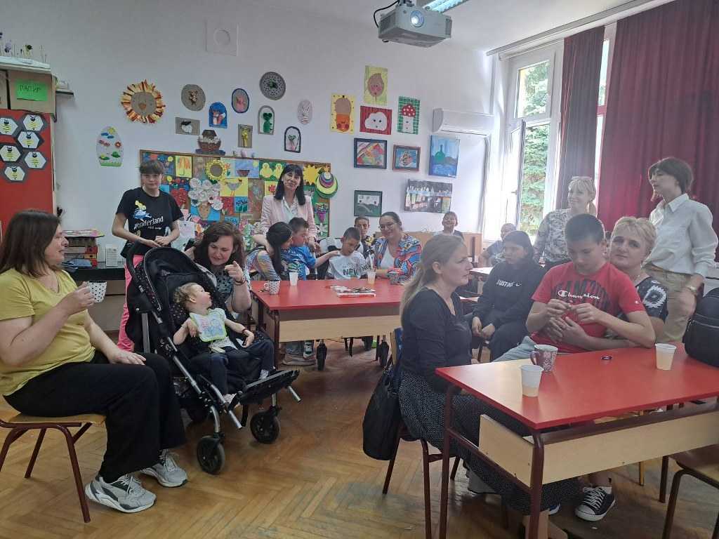 Након креативног дела, наставили смо дружење уз кафу, сокове и посластице – заједно са мамама и пратиоцима деце.