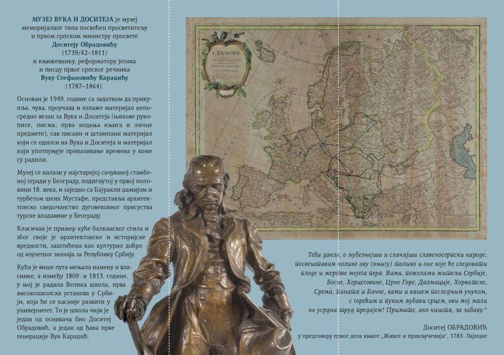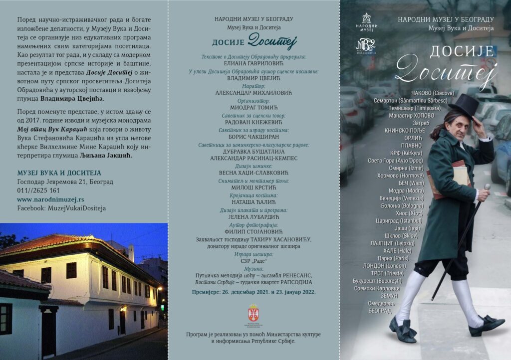 Монодрама “Досије Доситеј”, из пера Елиане Гавриловић, премијерно изведена 26. 12. 2021. инспирисана је животном причом нашег великог просветитеља, књижевника и филозофа Доситеја Обрадовића. Спајањем Доситејеве биографије и простора у коме се представа одвија у потпуности ће доћи до изражаја интерпретативна моћ музејског театра, кроз приказ једне историјске личности чије је дело нераскидиво повезано са здањем у коме се данас Музеј налази.