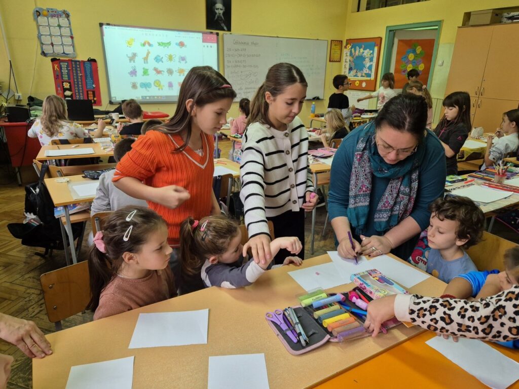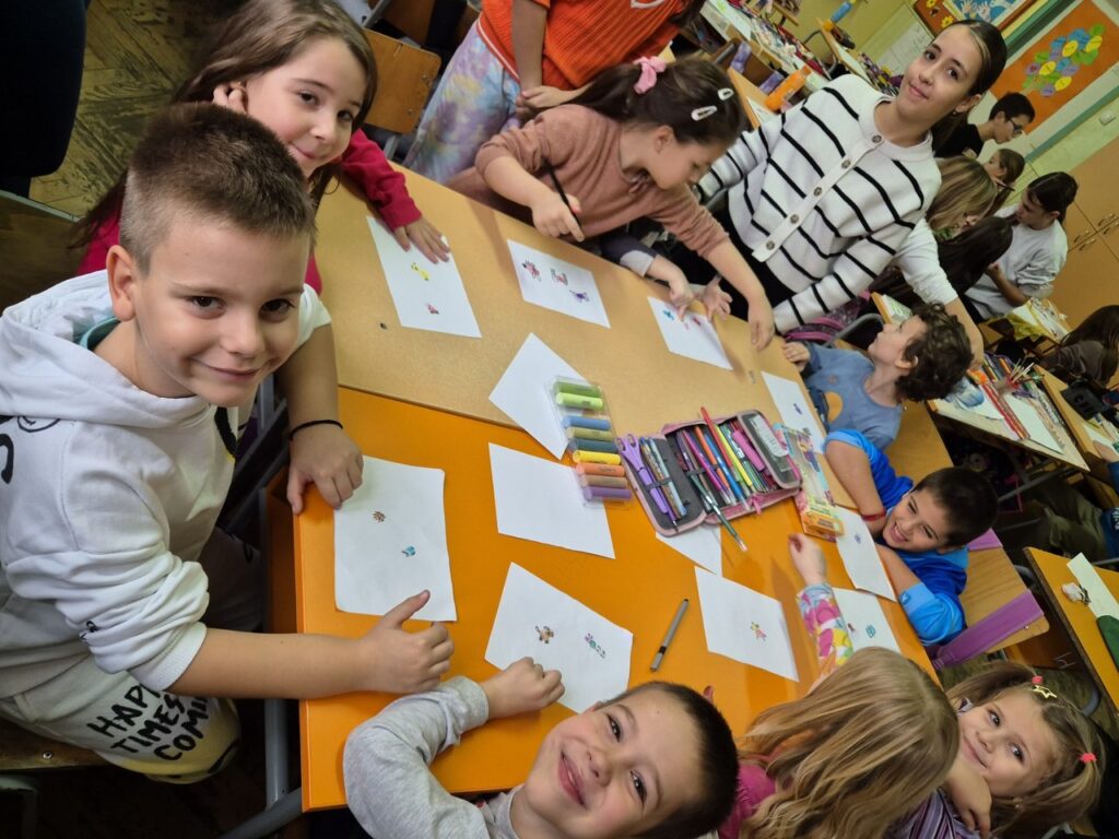 Ученици 4/2 угостили су децу припремне предшколске групе из наше школе, са васпитачицом Јеленом Радовић. На часу ликовног су отискивањем длана и прста правили нове цртеже. Кроз кратко дружење, показали смо будућим ђацима како да вежбају прстиће за писање и цртање, и како да нацртају животиње од свог отиска прста.