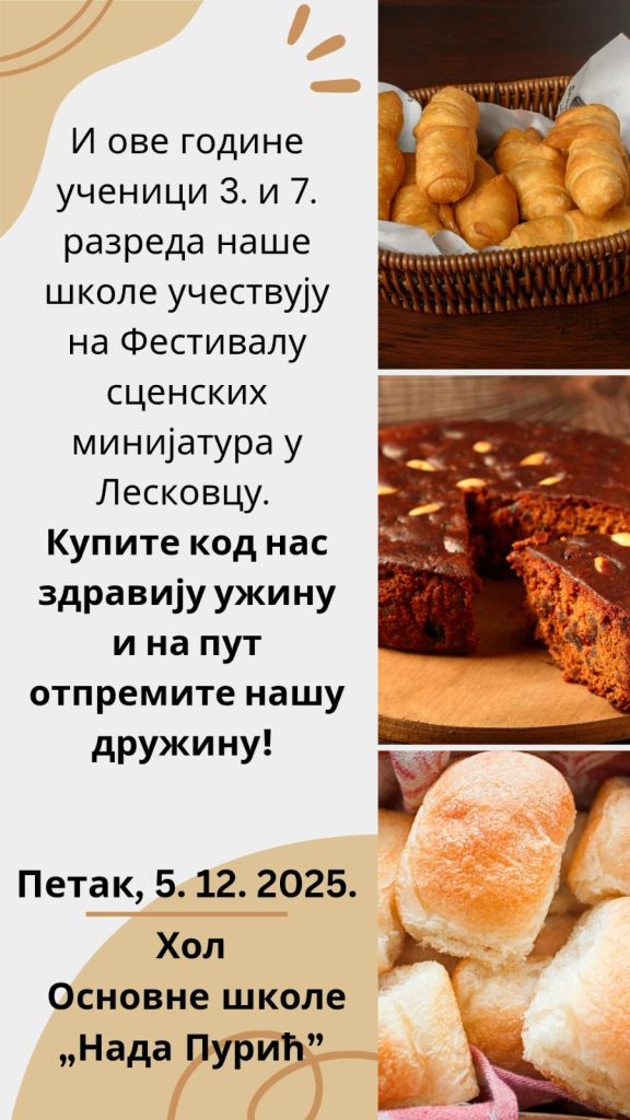 Такође, у петак и понедељак, наши ученици ће продавати здраву ужину (слаткише, пецива и пите), па вас позивамо да тих дана купите ужину код њих, јер ћемо и тај новац  уложити у одлазак до Лесковца и промовисање наше Школе и ваннаставних активности.